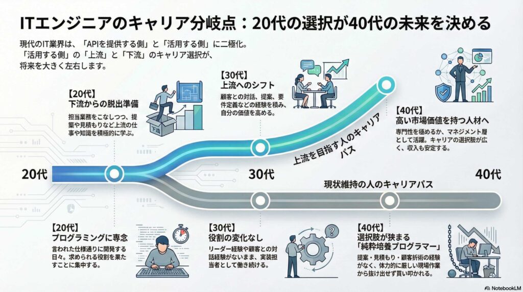 特に警鐘を鳴らしたのは、「API活用×下流」に居続けるキャリアの危険性です。 見積りを切ったことがない、顧客と直接話したことがない、お金の流れを知らない。こうした状態のまま年齢だけ重ねると、40代以降、体力的にも単価的にも非常に厳しくなります。