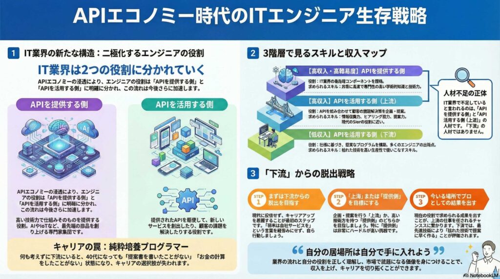 これからのIT業界では、エンジニアは大きく「API(仕組み)を提供する側」と「APIを活用する側」に二極化していくと予測しました。 さらに「APIを活用する側」は、上流(課題定義・設計・提案)と下流(実装・テスト)に分かれます。