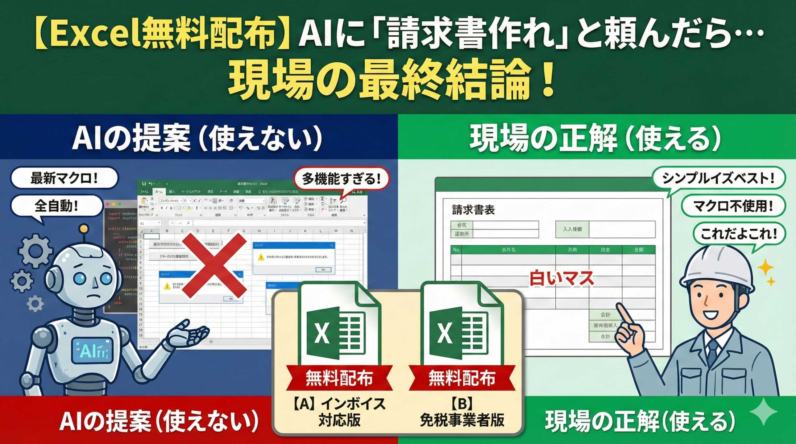 【Excel無料配布】AIに「最新の請求書を作れ」と頼んだら、現場で使えない代物ができた話|インボイス対応&免税用テンプレート