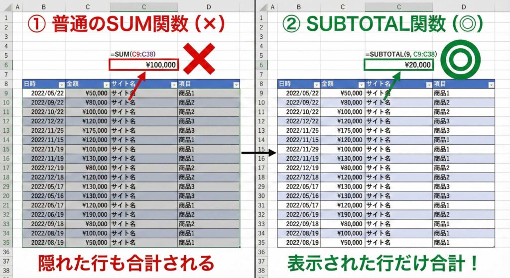 我々がやりたいのは「今、画面に見えているものだけ合計したい」ですよね。 その願いを叶えるのがこの関数です。
