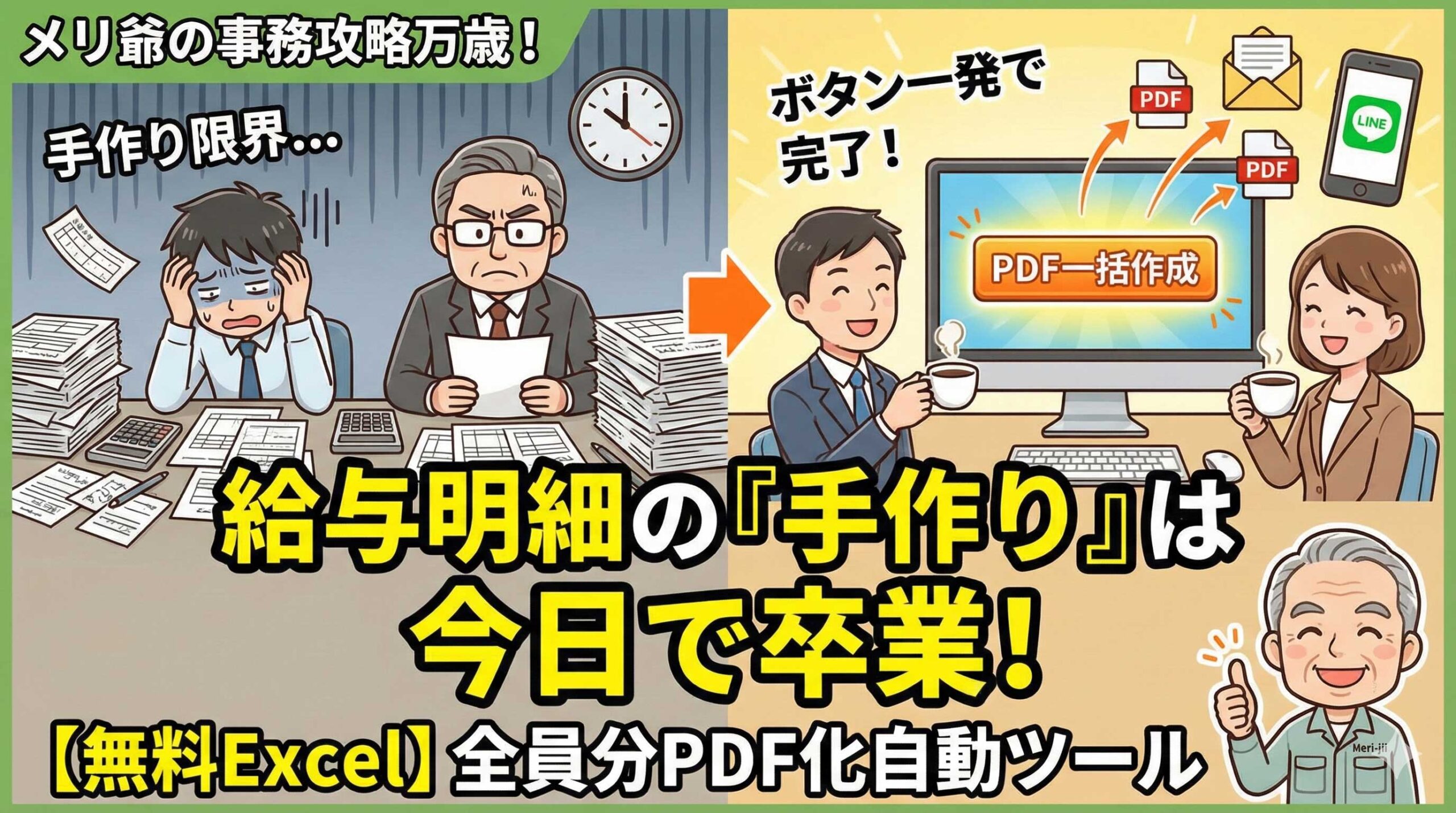 今日は、Excelさえあれば「ボタン一発で全員分の給与明細PDFを自動作成」し、メールやLINEで送れるようにする魔法のツールを無料配布します。