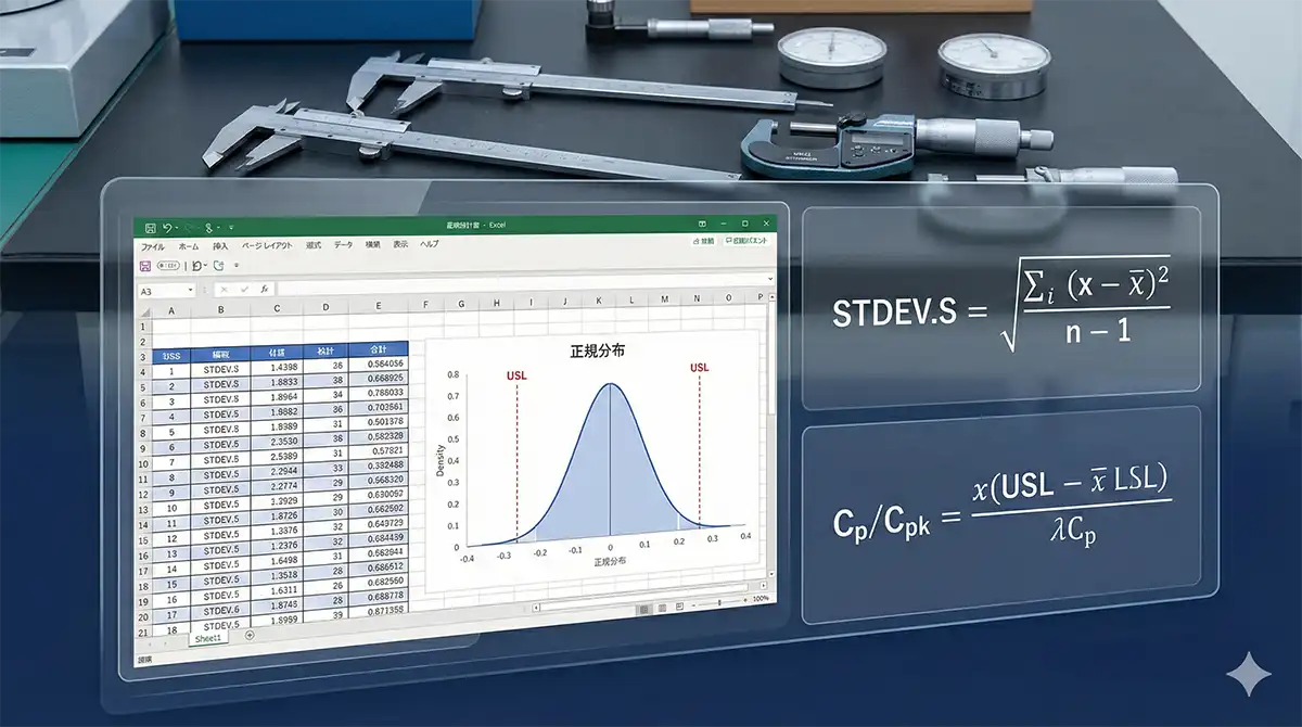 この記事では、ExcelのSTDEV.Sで標準偏差を出し、そこから3σ(平均±3×標準偏差)、さらにタイトルどおりCp/CpkまでExcelで算出できる形に落とし込みます。目的は「関数を知る」ではなく、品質報告書に貼れる形で、誰が担当でも壊れない運用にすることです。