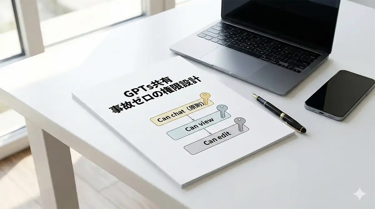 GPTs共有は「用途で仕分け→社内は最小権限→引継ぎルール」で事故をほぼ潰せます。特に社内共有のCan view settingsは“設計図の複製”になり得るので要注意です。